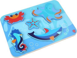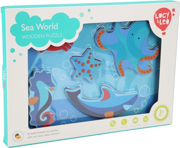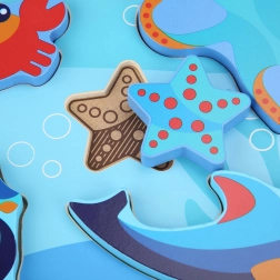 Otroške lesene puzzle z motivom morskih živali so zasnovane za učenje skozi igro. Šest barvitih kosov – na primer hobotnica, morska zvezda in morski konjiček – natančno sodi v izrezane oblike na trdni podlagi z oceanskim motivom. Kosi so dovolj veliki za dober oprijem in zaradi svoje debeline lahko samostojno stojijo.