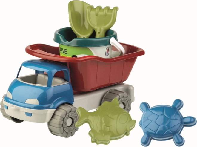 Androni set za pesek narejen iz recikliranih plastik ponuja zabavo za majhne otroke. Vsebuje avtomobilček, vedro, lopatko, grabljice in dve oblikovalci z morsko tematiko, idealno za pesek ali plažo.