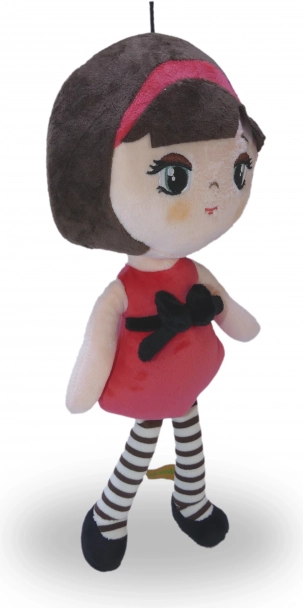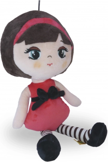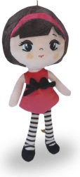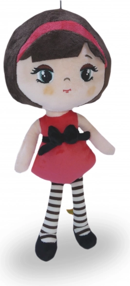 Punčka je oblečena v rdečo obleko s črnim trakom, ki pritegne pozornost.