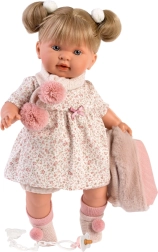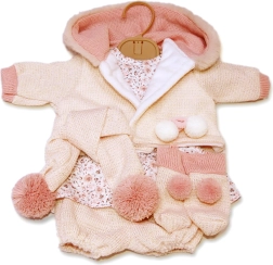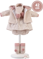 Vse za odličen outfit: jopica s kapuco, cvetlični overal/obleka, šal s cofki, nogavičke, rokavičke in elastike za lase za usklajen videz punčke.