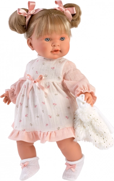 Stilski 4-delni komplet oblačil za punčko 42 cm znamke LLORENS razveseli z nežno rožnato oblekico, mehko vestico in hlačkami; priložen je tudi obešalnik. Izdelano v Španiji, idealno za vsakodnevno igro in posebne trenutke. Primerno od 3 let.