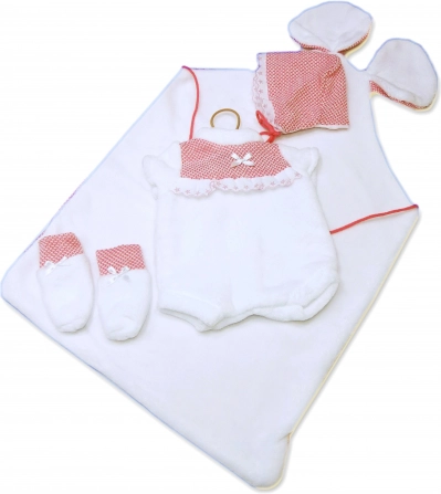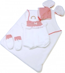 Del kompleta je 3-delni set in okrasna blazinica z ušeski za še več zabave pri negi punčke. Pakirano v plastični embalaži s plastičnim ali kartonskim obešalnikom – enostavno shranjevanje in podarjanje.