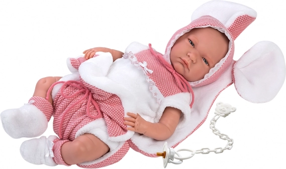 Slogovno 3-delno oblačilo za punčko NEW BORN znamke Llorens velikosti 40–42 cm bo razveselilo vsako malo negovalko. Komplet vključuje usklajene kose in okrasno blazinico z ušeski, izdelan je v Španiji in dostavljen v praktični embalaži na obešalniku. Idealno za kreativno igro in preoblačenje punčk od 3 let naprej.
