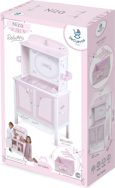 Zaradi natančnega španskega dizajna in skrbno izbranih materialov omara deluje lahkotno in čisto. Praktične mere zagotavljajo stabilnost in dovolj prostora za vse potrebščine za nego punčke do dolžine 45 cm.