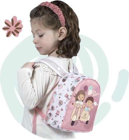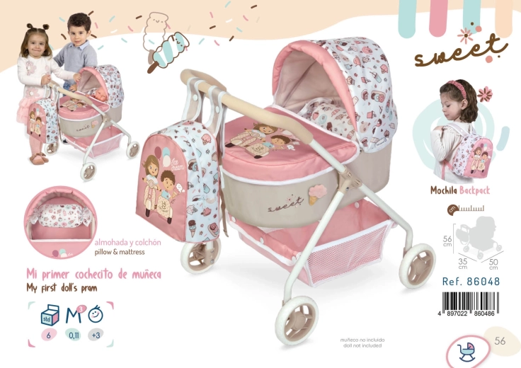 Voziček je opremljen z mehko vzmetnico in blazinico, ki zagotavljata udobje za punčke med sprehodi. Vključuje tudi praktičen nahrbtnik, v katerega lahko otroci shranjujejo manjše dodatke za svoje punčke. Zaradi trdnih koles in stabilne konstrukcije je voziček varen in enostaven za upravljanje.