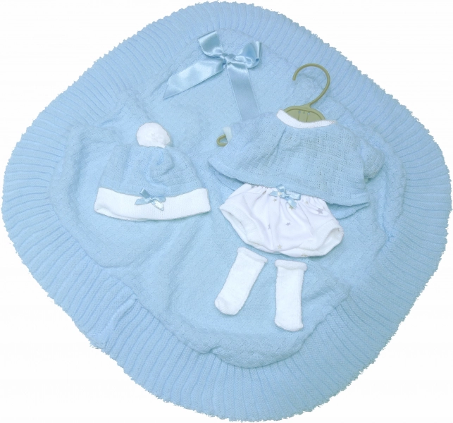 Elegantna 4-delna garderoba za lutko novorojenčka velikosti 35-36 cm vključuje okrasno odejico s pentljo. Popoln komplet za igro in stilizacijo vaše lutke.