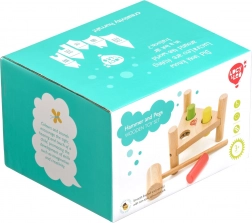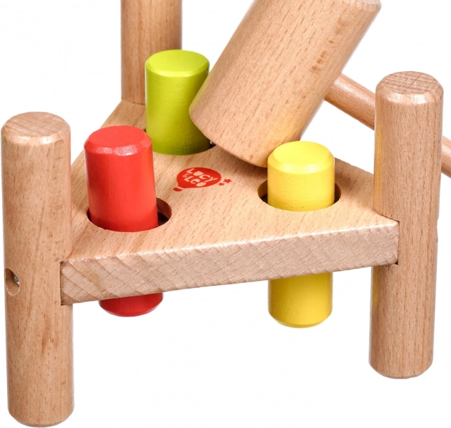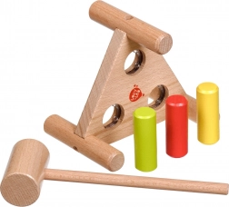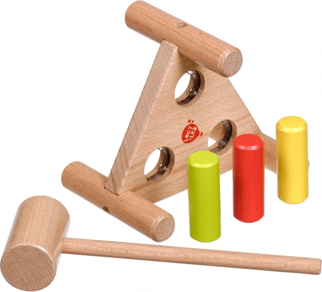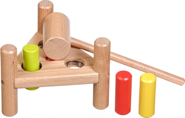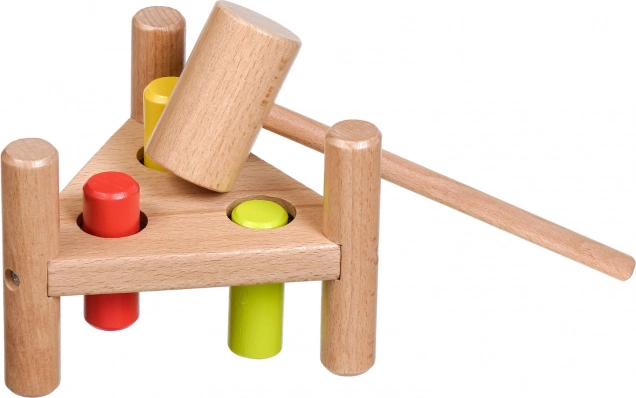 Zabijanje barvnih klinov s kladivcem krepi fino motoriko, natančnost prijema in koordinacijo oko–roka pri malih otrocih.