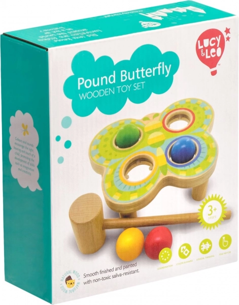 To kakovostno leseno tolkalo v obliki metulja bo razveselilo otroke z veselimi barvami in pametnim igralnim principom. Otrok s kladivcem nežno udari po barvnih kroglah, te pa padejo v odprtine enake barve, s čimer vadi koordinacijo in prepoznavanje barv.