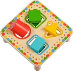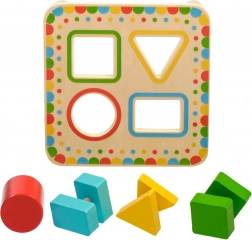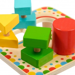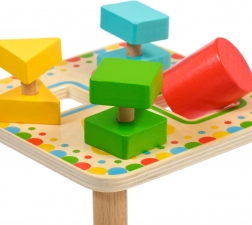Plošča na stabilnih nožicah ima štiri barvno uokvirjene odprtine, ki se ujemajo z barvami posameznih koščkov. Komplet je idealen za samostojno igro ali skupno raziskovanje s starši ter je odlična lesena izobraževalna igrača za predšolske otroke.