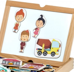 Ta ustvarjalni magnetni set otrokom na igriv način približa svet poklicev – od gasilca in policista do kuharja ali pilota. Z dvostranskimi kartami lahko otroci sestavljajo prave kombinacije ali ustvarjajo lastne like in prizore. Praktičen lesen kovček z magnetno tablo omogoča udobno shranjevanje vseh delov in enostavno prenašanje na poti.