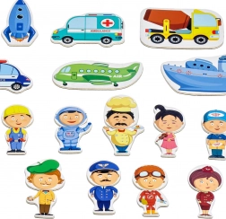 Bogata zbirka magnetnih delov in dvostranskih kart spodbuja otroke k pravilnemu ujemanju ter svobodnemu ustvarjanju pri spoznavanju različnih poklicev.