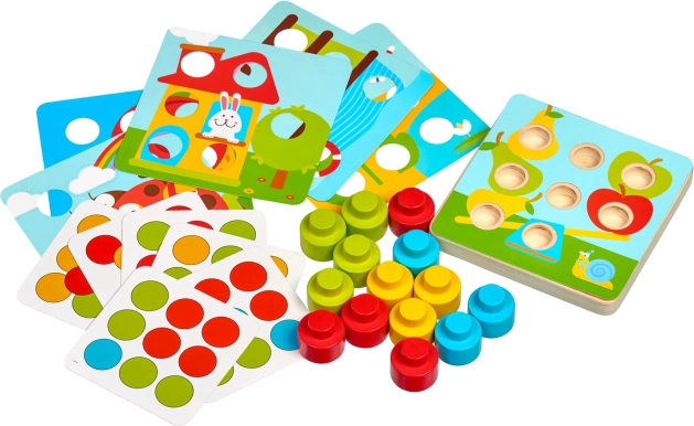 - 1× lesen podstavek z odprtinami, 14× velik barvni lesen zatič, 12× obojestranska predloga (6 perforiranih slik + 6 barvnih šablon)