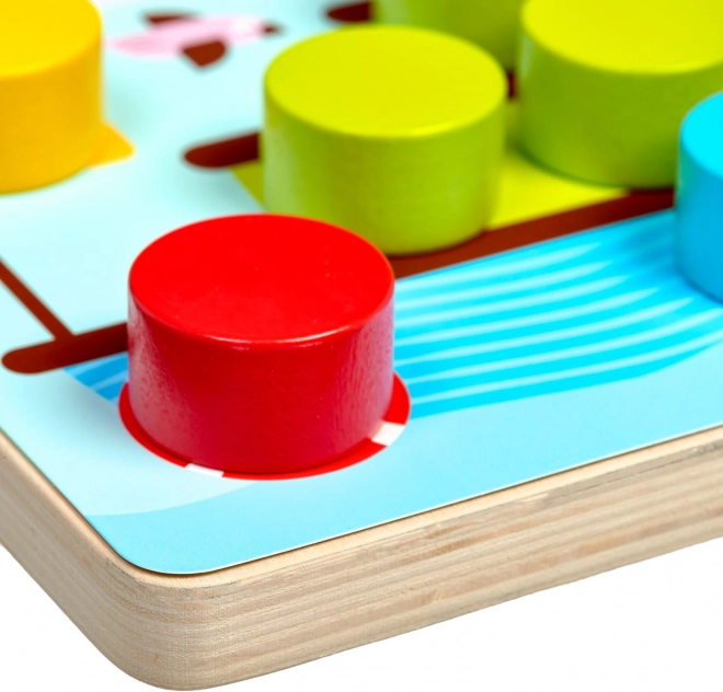 Veliki leseni zatiči se zlahka primejo in vstavljajo v odprtine, kar podpira koordinacijo oko–roka in učenje barv skozi naravno igro.