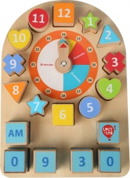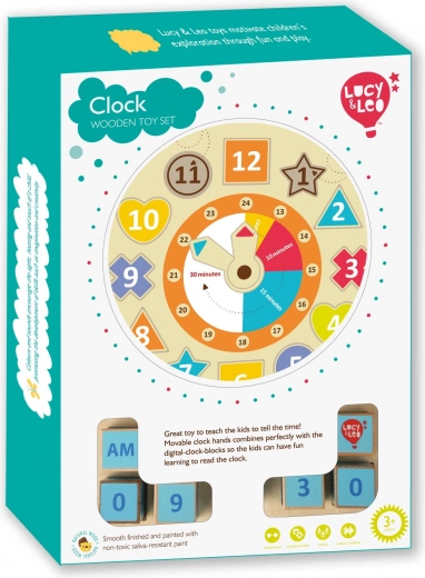 Lesena učna plošča LUCY & LEO združuje sestavljanko in uro. Otroci razporejajo barvne oblike s številkami okoli številčnice, vrtijo kazalce in se tako učijo analogni in digitalni čas. S kockami AM/PM zlahka razumejo razliko med dopoldnevom in popoldnevom ter vadijo angleške oznake časa.