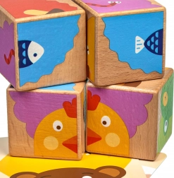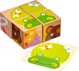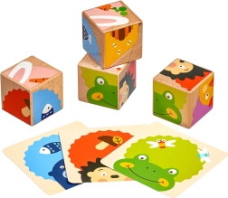 Iz štirih lesenih kock otroci sestavijo do šest različnih slik po priloženih predlogah. Vsak obrat prinese novo, zabavno nalogo in ohranja pozornost malih graditeljev.
