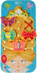 Leseni prepletalni set Princesa prinaša igrivo učenje in veliko domiselne zabave. Na veliki podlagi s princeso si lahko otroci ustvarjajo lastne pričeske in jih krasijo s kronami, pentljami ali metuljčki, ki jih s pomočjo vezalk pritrdijo v vnaprej pripravljene odprtine. Aktivnost spodbuja potrpežljivost, zbranost in razvoj fine motorike.