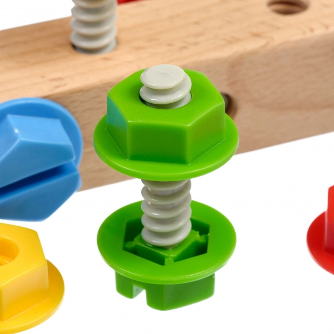 Igrača je idealna za predšolske otroke in podpira naravno učenje skozi igro. Zahvaljujoč intenzivnim barvam si otroci zlahka urijo barvno ujemanje in razvrščanje, medtem ko vijakanje v leseni blok razvija tehnično razmišljanje in potrpežljivost.