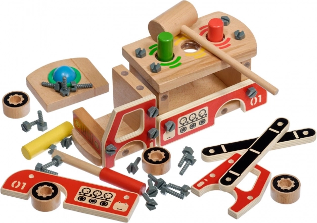 Ta ustvarjalni set združuje gradbeni komplet in zabijanko v enem. Otroci najprej sestavijo robustno leseno gasilsko vozilo, nato pa na njegovem kesonu uporabijo štiri odprtine za zabavno zabijanje barvnih elementov s kladivcem. Zahvaljujoč živim barvam in raznolikim oblikam igrača podpira naravno učenje in osredotočenost.
