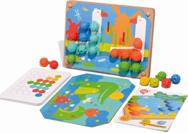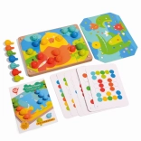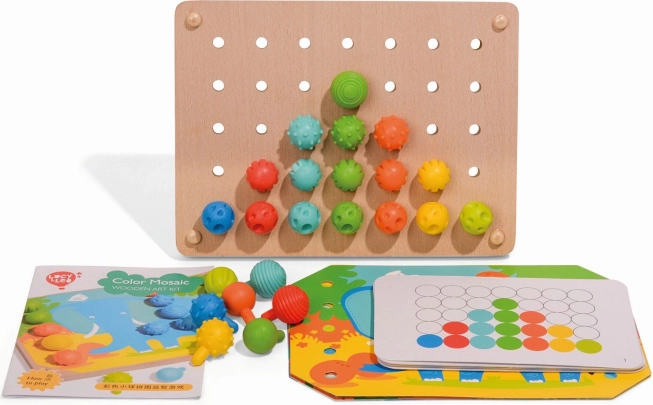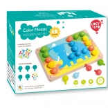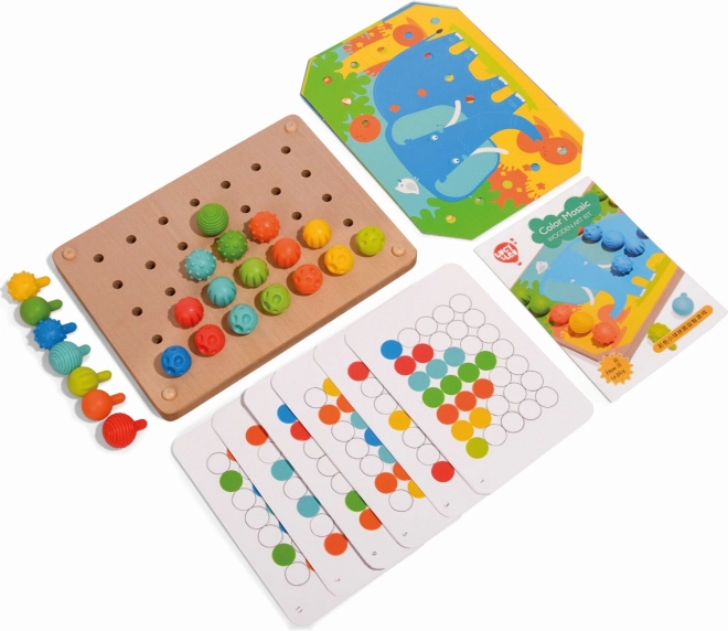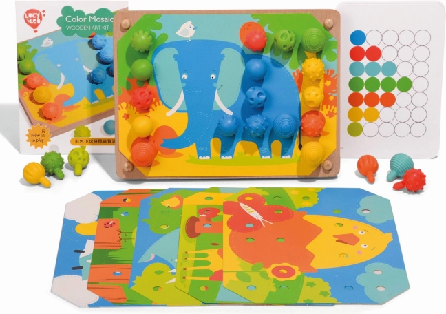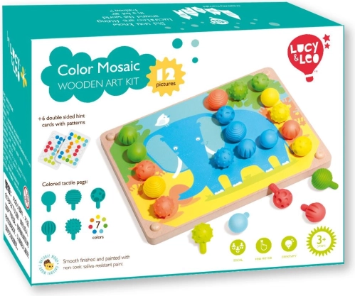 Mozaika in vezenje je odlično orodje za malčke za razvoj finih motoričnih spretnosti in kreativnosti. Vsebuje 35 velikih silikonskih čepkov v sedmih živahnih barvah, ki jih otroci lahko uporabijo za izpolnjevanje barvnih predlog. Set vsebuje tudi 12 barvnih slik z živalmi in 6 dvostranskih šablon.