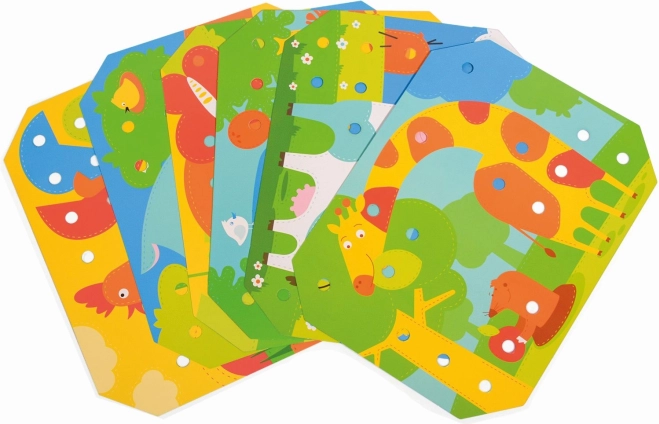 Komplet vsebuje 12 barvnih slik z živalmi in 6 dvostranskih šablon, ki ponujajo številne ustvarjalne možnosti.