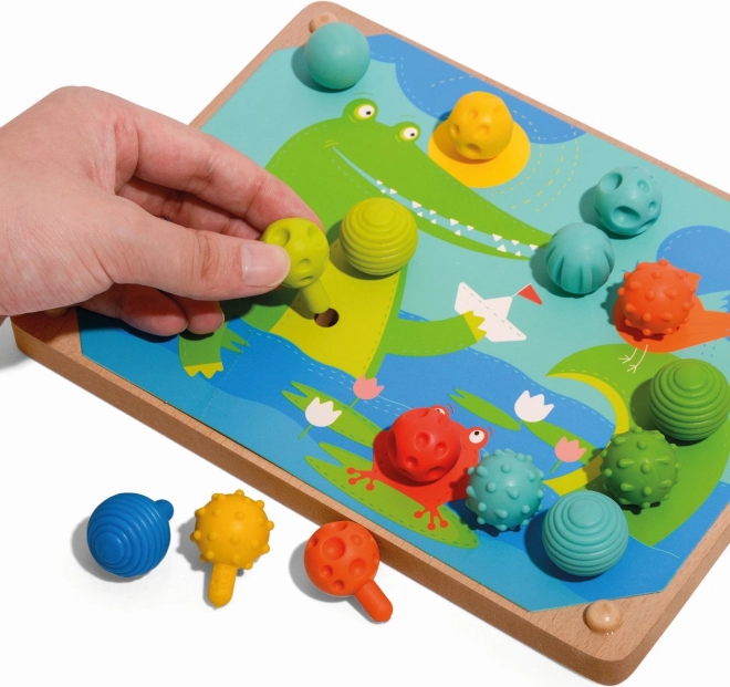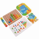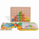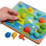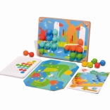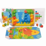 Ta igralni set razvija fino motoriko in ustvarjalno razmišljanje otrok zahvaljujoč 35 različno strukturiranim silikonskim čepkom in barvnim predlogam z živalmi.