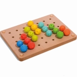 Leseno stojalo z luknjami omogoča enostavno nameščanje čepkov, medtem ko barvne vezalke dodajo še eno dimenzijo igre – možnost vezenja. Lastnosti te igrače jo naredijo za odlično izobraževalno orodje, ki se uporablja tudi v Montessori okolju.
