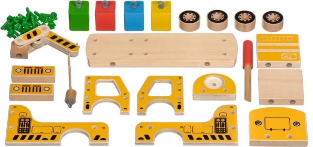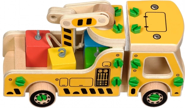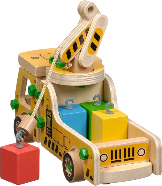 Pakiranje vsebuje 16 lesenih delov za sestavo žerjava, vijake, izvijač in 4 barvne kocke, ki predstavljajo tovor. Igrača je tudi Montessori pripomoček, ki otroku pomaga učinkovito razvijati različne spretnosti.
