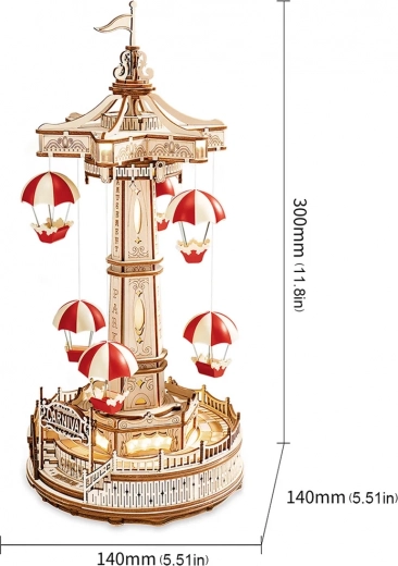 Ta dovršena 3D lesena sestavljanka je navdihnjena s klasičnim padalskim stolpom iz zabaviščnega parka. Šesterokotna osnova in stranska prosojna okna spuščajo toplo svetlobo, ki poudari edinstveno atmosfero. Vrtiljak poganja baterijski motor in osvetljujejo LED lučke, pri čemer tapno upravljanje omogoča ločeno vodenje gibanja in zvoka.