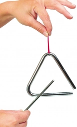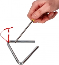 Triangel držite za rdečo vrvico in ga nežno udarite s paličico – tudi mali otroci zlahka izvabijo lep, dolgo odzvanjajoč zvok, ki krepi občutek za ritem.