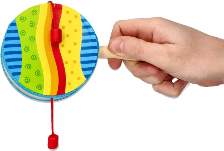 Tradicionalni »beraški boben« v sodobni izvedbi znamke GOKI je odličen spremljevalni instrument za otroke. Zavrtite ročaj in rdeče kroglice na vrvici bodo ritmično udarjale ob membrano bobenčka. Hitrost vrtenja naravno spreminja tempo in značaj zvoka, kar podpira slušno zaznavo in občutek za ritem.