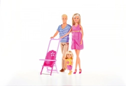 Komplet Steffi Happy Family vsebuje 3 punčke: nosečo Steffi, Kevina in malo Evi v vozičku.Vključuje tudi več kot 19 dodatkov.