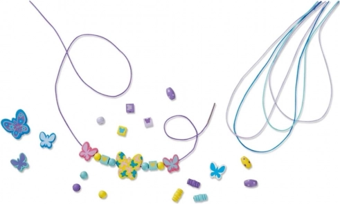 Komplet vsebuje lesene perlice različnih oblik (metuljčki, cvetovi, kroglice) in tekstilne vrvice – idealno za izdelavo ogrlic in zapestnic. Razvija fino motoriko in ustvarjalnost, priporočeno od 4 let.