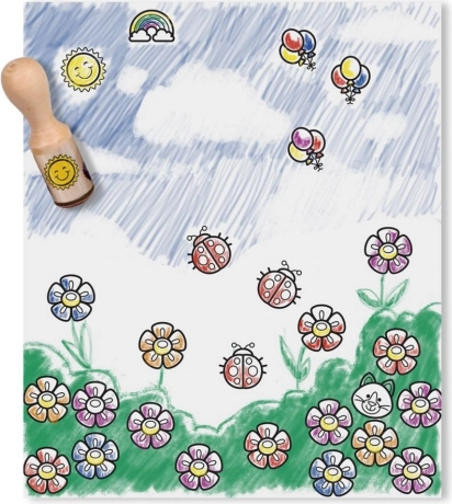 Trpežna lesena telesa z motivi, kot so sonček, srček ali metulj, zagotavljajo udoben oprijem in lepe odtise na papirju.