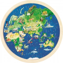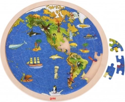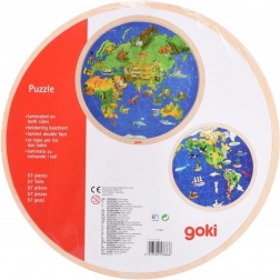 Ta dvostranska lesena sestavljanka GOKI združuje zabavo in učenje. Vsaka stran prikazuje eno poloblo z izrazitimi ilustracijami kontinentov, živali in znamenitosti, ki otroke motivirajo k spoznavanju sveta. Obodni frezani rob pomaga pri sestavljanju in povečuje uspeh tudi pri mlajših otrocih.