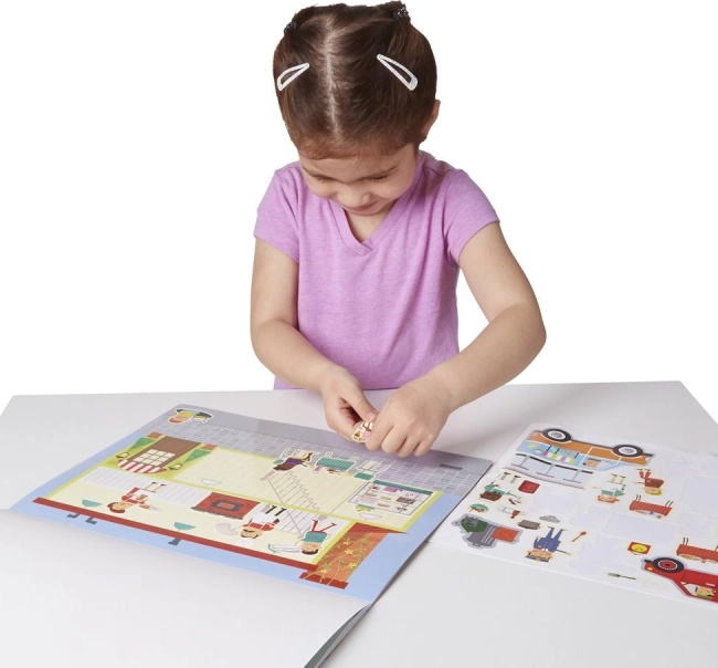 Otroci lahko znova in znova razporejajo nalepke in tako ustvarjajo nove prizore.