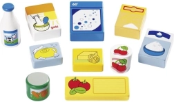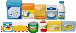 Barvni leseni kosi spominjajo na vsakdanja živila (mleko, testenine, žitarice idr.) in otroke spodbujajo k naravnemu učenju skozi igro.