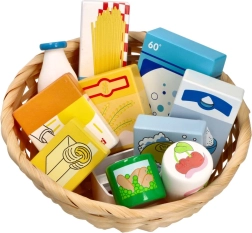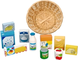 Ta ljubek set za otroško trgovino vsebuje izbor lesenih živil v naravni pleteni košari. Zahvaljujoč realističnemu videzu in živim barvam si otroci urijo besedni zaklad, fino motoriko ter socialne veščine pri igri prodajalca in kupca.