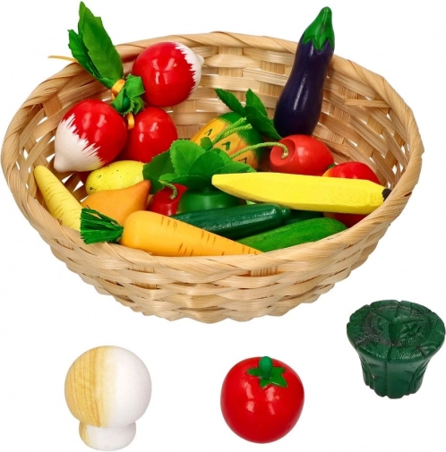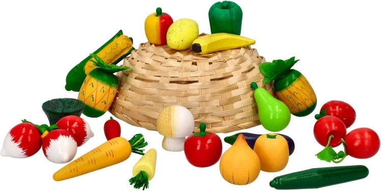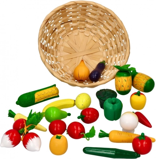 Komplet vključuje pester izbor sadja in zelenjave z živahnimi barvami, ki spodbujajo vizualno zaznavo in učenje poimenovanja živil.