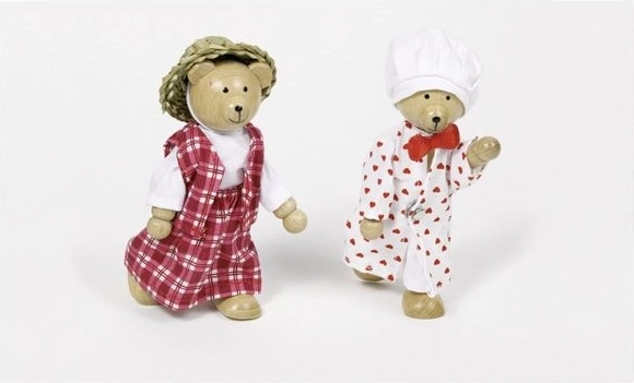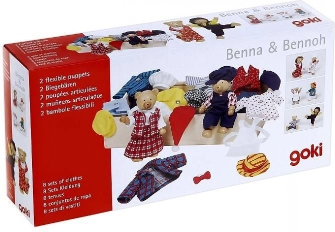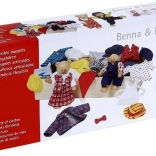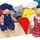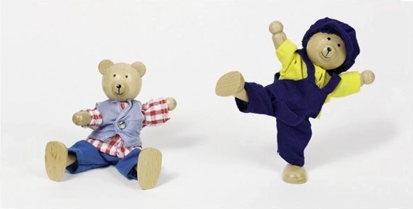 Ta ljubek komplet prinaša dvojico medvedkov z bogato ponudbo oblačil in dodatkov, shranjenih v pregledni leseni škatlici. Otroci lahko sestavljajo glavice, telesa in nogice, ustvarjajo vesele kombinacije ter se učijo barv in razpoloženj.