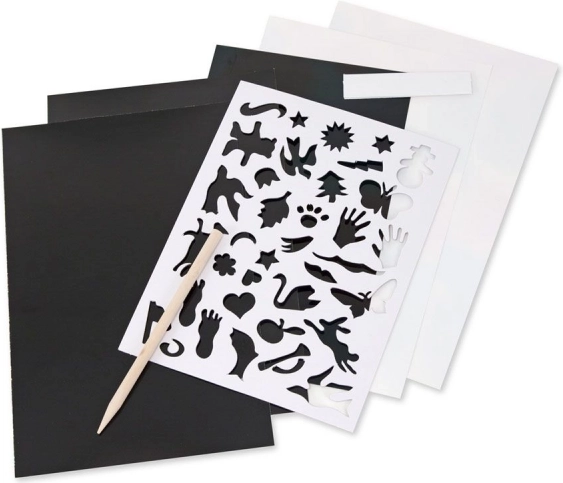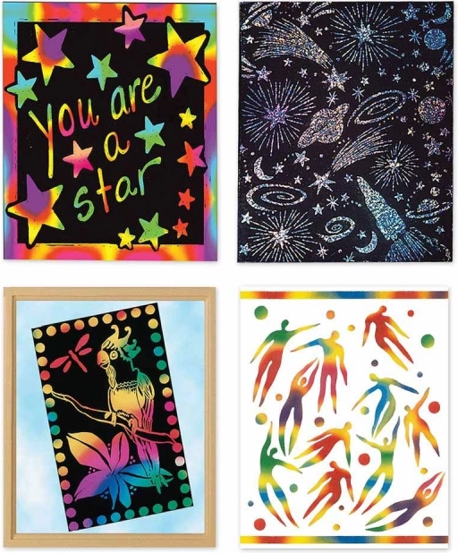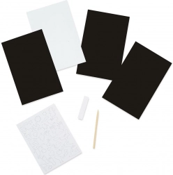 S tem kompletom bodo otroci in odrasli ustvarili izvirna umetniška dela. Dovolj je, da nežno praskate s priloženo paličico po črni površini in pod njo se razkrijejo mavrične ali holografske barve. Končane slike lahko preprosto uokvirite in razstavite.
