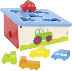 Ta kakovostna lesena vstavljanka GOKI z odpiralnim pokrovom in izrezi v oblikah vozil je idealen pripomoček za prvo spoznavanje oblik. Otroci se na zabaven način učijo prepoznavati oblike in barve, razvijajo koordinacijo oko–roka ter urijo fino motoriko prstov.
