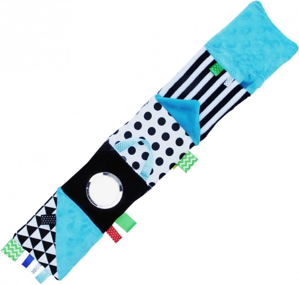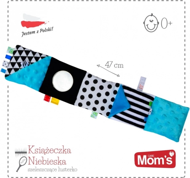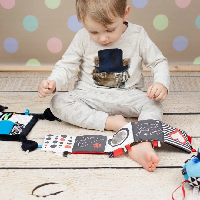 Ta mehka tekstilna knjigica je zasnovana posebej za novorojenčke in dojenčke. Kontrastni vzorci pritegnejo otrokovo pozornost in podpirajo razvoj vida, medtem ko raznolike teksture in šušteči elementi spodbujajo tipno zaznavanje in radovedne prstke. Vgrajeno varno ogledalce pomaga otroku odkrivati lastni odsev in uriti samospoznavanje.