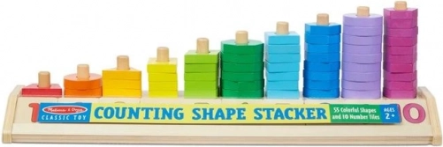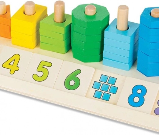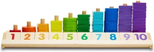 Ta lesena izobraževalna igrača združuje računanje, prepoznavanje barv in oblik v eno zabavno celoto. Na leseni osnovi je 10 količkov z oštevilčenimi položaji, na katere otroci nameščajo ustrezno število obročkov. Vsaka številka na snemljivem kvadratku je v barvi, ki ustreza barvi obročkov, kar učenje močno olajša in naredi preglednejše.