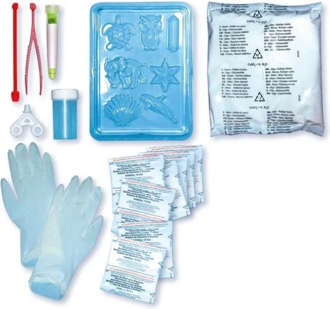 Vsebina kompleta vključuje kemikalije in kalupe za ustvarjanje različnih oblik, tako da lahko eksperimentirate in dosežete impresivne rezultate. Odlično kot izobraževalno darilo in za šolske projekte.