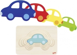 Ta kakovostna lesena vstavljanka je sestavljena iz več plasti različno velikih avtomobilov, ki jih otroci vstavljajo v ustrezne izreze. Vsak avto je izrezan iz enega kosa lesa in v določeno plast ustreza le pravi košček – tako otroci naravno razvijajo prostorsko predstavo in logično mišljenje.