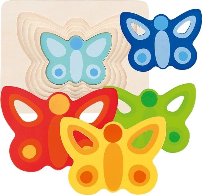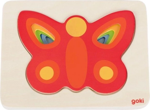 Odkrijte igrivo večplastno vstavljanko z motivom pisanih metuljev znamke GOKI. Otroci se bodo ob sestavljanju zabavali, hkrati pa razvijali fino motoriko, prepoznavanje barv in logično razmišljanje. Sestavnih delov je pet in v vsako plast sodi le en metulj, kar spodbuja potrpežljivost in zaporedno učenje.