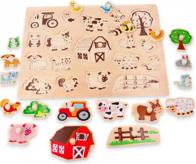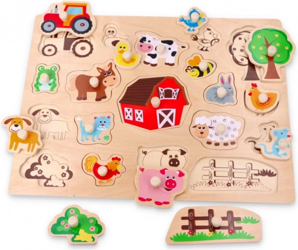 Ta robustna lesena vstavljanka otrokom ponuja prvi stik s svetom kmetije. Barvni, lakirani koščki z jasnimi obrisi se zlahka prilegajo podlagi iz naravnega lesa. Vsak košček se zahvaljujoč ročaju dobro drži tudi v majhnih rokah, kar spodbuja razvoj fine motorike in potrpežljivosti.