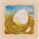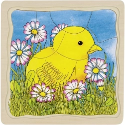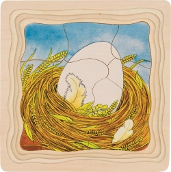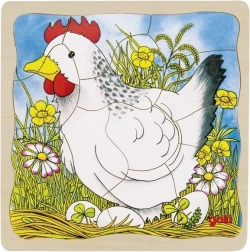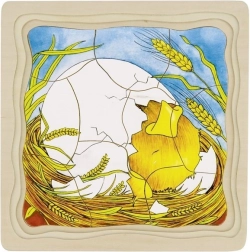 Ta izjemna lesena sestavljanka je razdeljena na štiri plasti slik, pri čemer vsaka predstavlja eno razvojno fazo kokoši. Vsaka plast ima drugačen dizajn in različno število koščkov, kar zagotavlja raznolikost in spodbuja otroško domišljijo. Sestavljanka je nameščena v trdni plošči z izdelanimi robovi, ki služijo kot stabilna podlaga za sestavljanje.