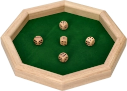 Stilna namizna igra VRHCÁBY znamke GOKI za zabavo z družino in prijatelji. Igra se s 5 kockami, zapisujejo se kombinacije, cilj pa je zbrati čim več točk. Kakovostna lesena izdelava in semišasta igralna površina zagotavljata prijetno tihe mete. Kompaktna mera 25,7 × 25,7 cm, kocke 1,6 cm.