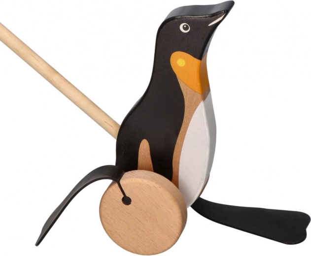 Lesena vlečna igrača v obliki pingvina prinaša veselje in razvija otroke skozi igro.